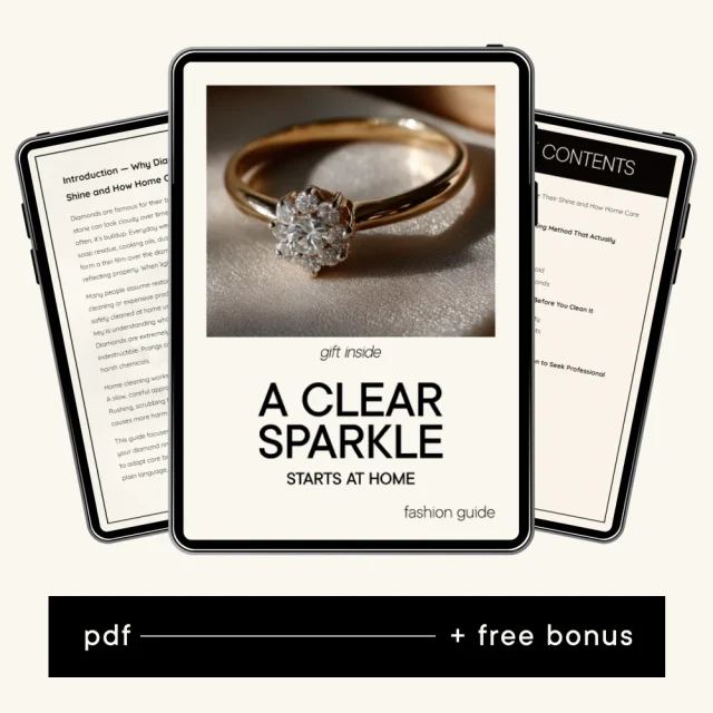 Your diamond ring should sparkle every time it catches the light—but daily wear, lotions, and household grime can quietly dull its shine. A Clear Sparkle Starts at Home is a practical, easy-to-follow digital guide designed to show you exactly how to clean your diamond ring at home without risking damage. Whether your ring is brand new or a cherished heirloom, this guide empowers you to restore its brilliance using safe, proven methods you can trust.