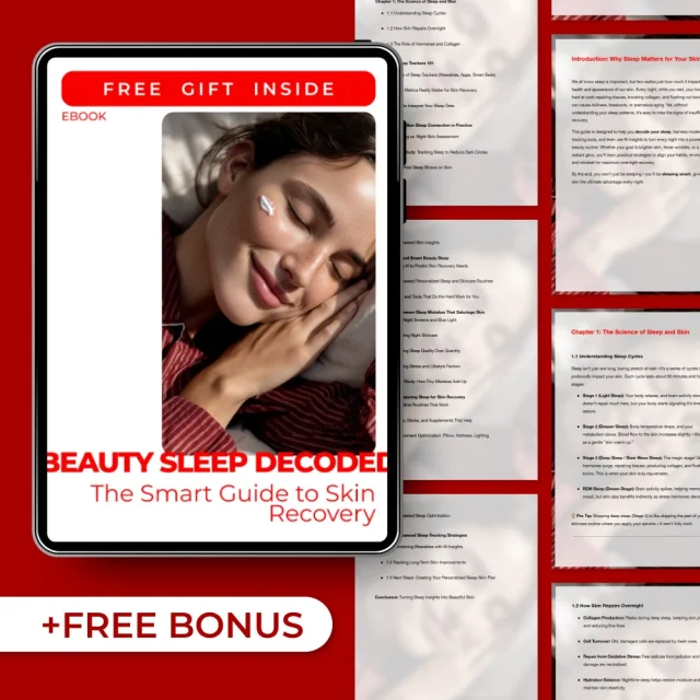 This guide is perfect for anyone looking to improve their skin health while sleeping. Whether you’re dealing with dark circles, dullness, or just want to wake up to a fresher complexion, Beauty Sleep Decoded provides actionable advice backed by science and technology. Unlike other skincare books, this eBook goes beyond basic sleep tips and incorporates cutting-edge AI and sleep tracker insights to give you personalized recommendations. By using sleep trackers for skin recovery, you’ll have all the tools you need to track your progress, understand your skin’s needs, and optimize your sleep for beautiful skin.