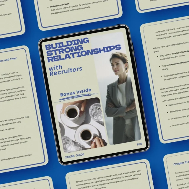 If you’ve ever wondered why some job seekers seem to get noticed faster, hear back more often, and unlock opportunities before they’re even posted, the answer often comes down to one skill: relationship-building. Building Strong Relationships with Recruiters is a practical, easy-to-follow digital guide designed to help you understand how recruiters think, what they look for, and how to create genuine professional connections that can support your long-term career growth. Whether you are actively job hunting, preparing for a career move, or simply want to expand your network the smart way, this guide gives you a clear roadmap for how to build relationships with recruiters in a way that feels authentic, professional, and effective.
