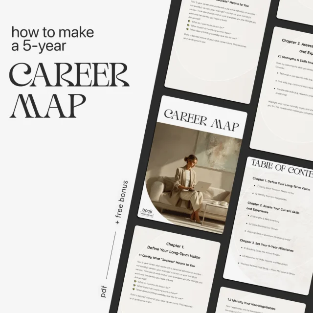 If you’re ready to take control of your career instead of reacting to it, Career Map is your next step. Stop guessing and start building. Download your digital copy today and finally learn how to make a 5-year career plan with clarity, confidence, and strategy.