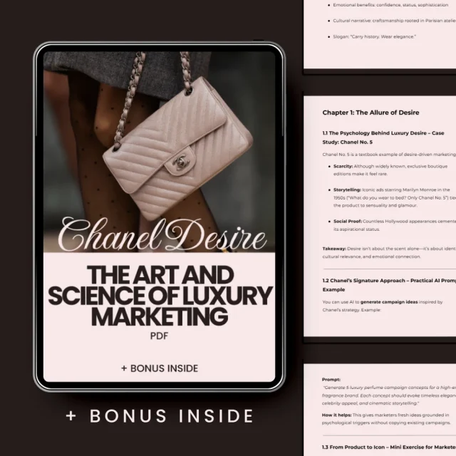 • Chapter 4: Bringing Chanel Desire Into Your Strategy – Practical tips on adapting Chanel’s luxury marketing methods for your own brand, including AI prompts and campaign planning strategies.