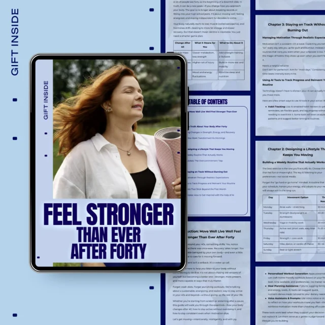 Unlike generic fitness plans, Feel Stronger Than Ever After Forty focuses on lifestyle design, not rigid programs. It acknowledges recovery, motivation, and time as real factors—and shows how modern AI tools can support progress instead of overwhelm.