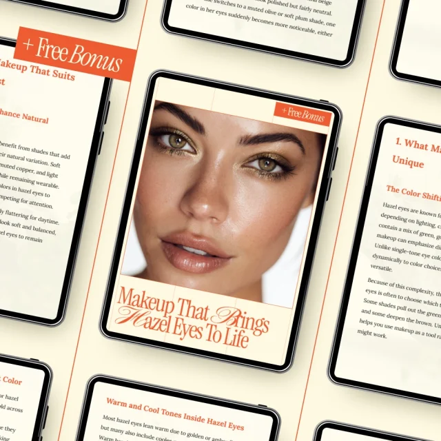 Unlike generic makeup eBooks, this guide focuses entirely on hazel eyes and their unique color complexity. It blends classic color theory with modern AI tools, helping you move beyond trends and into a style that truly fits you.