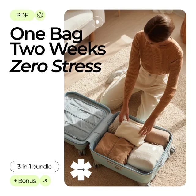 Imagine packing everything you need for a two-week adventure into a single carry-on—without the stress, the guesswork, or overpacking. One Bag, Two Weeks, Zero Stress is your ultimate 3-in-1 digital bundle designed to make packing simple, smart, and efficient. Whether you’re jetting off for business, pleasure, or a mix of both, this bundle shows you exactly how to pack a carry on for two weeks, so you can travel lighter, move faster, and enjoy every moment of your trip.