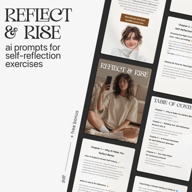 Reflect & Rise is a transformative digital download designed to help you build a powerful, consistent self-reflection routine using the support of AI. Blending the clarity of a guide, the depth of an eBook, and the simplicity of a checklist, this resource gives you everything you need to understand yourself better, set meaningful goals, and create a growth-focused mindset. Whether you’re new to self-reflection or want to deepen your practice, this beautifully structured tool makes the journey simple, encouraging, and inspiring.