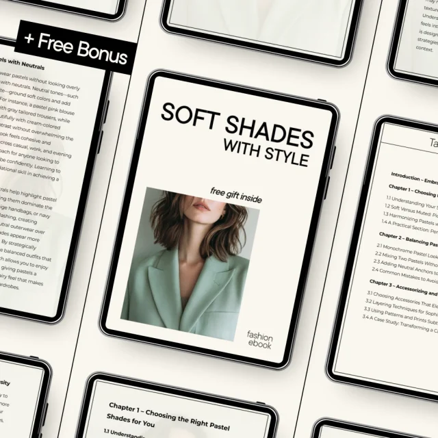 Unlock the secret to sophisticated pastel styling with Soft Shades with Style, your ultimate guide to incorporating the elegance of pastels into your wardrobe. Whether you’re new to soft colors or looking to refine your style, this eBook offers a wealth of insights and practical tips to help you embrace pastels with poise. Perfect for fashion lovers who want to elevate their look, the guide walks you through every step—from selecting the right shades for your skin tone to mastering the art of accessorizing.