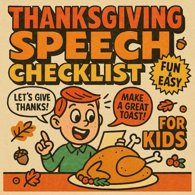 Make this Thanksgiving memorable by giving your child the gift of confidence and creativity. Download the Thanksgiving Speech Checklist for Kids now and help them deliver a heartfelt speech that will inspire smiles, laughter, and gratitude at the table.