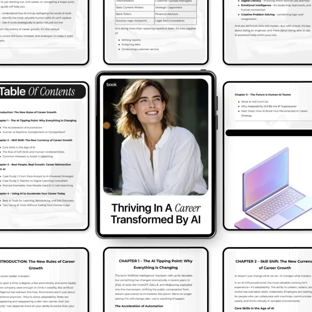 Thriving in a Career Transformed by AI is a digital download you can access instantly. Take control of your future, learn how to work with AI—not against it—and start building a career that grows with change. Download now and take your next smart step forward.