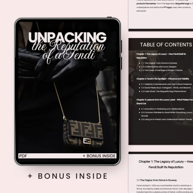 What makes this guide unique? Unlike other fashion resources, this guide not only tells you about Fendi’s legacy but also gives you concrete strategies to apply to your own fashion venture. Learn how to emulate Fendi’s success and avoid common pitfalls when launching your own brand. With chapters dedicated to using AI for trend forecasting and practical steps for starting your e-commerce business, this guide offers real-world value for entrepreneurs and aspiring influencers alike. Whether you’re tracking trends, analyzing celebrity endorsements, or learning marketing strategies, this guide equips you with the tools to succeed.