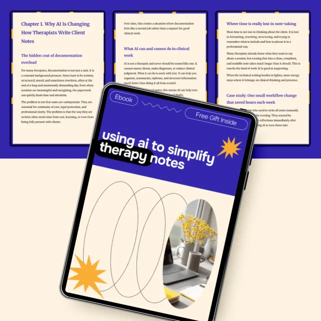 Documentation doesn’t have to be the most exhausting part of your clinical day. Using AI to Simplify Therapy Notes is a practical, therapist-centered eBook designed to help you reduce time spent on client notes while maintaining clarity, ethics, and professional judgment. Instead of hype or tech jargon, this guide shows you how to use AI thoughtfully as a documentation assistant—not a replacement for clinical thinking. You’ll learn where AI genuinely helps, where it doesn’t belong, and how to build a sustainable system that supports both your clients and your own wellbeing.